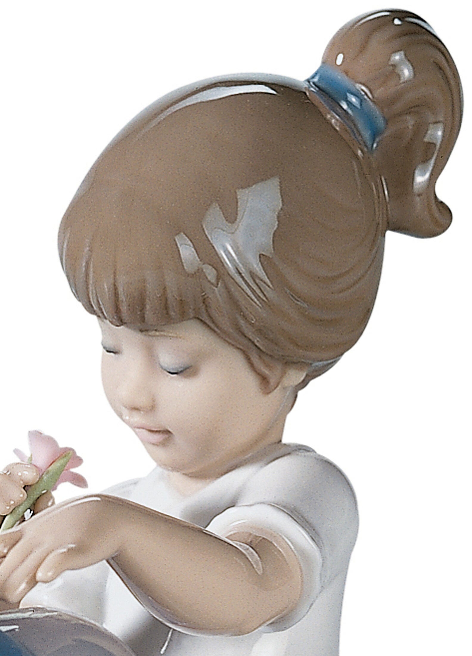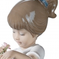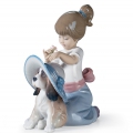 Figura ragazza glitterata di porcellana con un fiocco rosso che decora il vestito, mettendo un cappello al suo cucciolo con un fiore in mano. Altezza: 15 cm; Lunghezza: 13 cm; Profondita: 8 cm