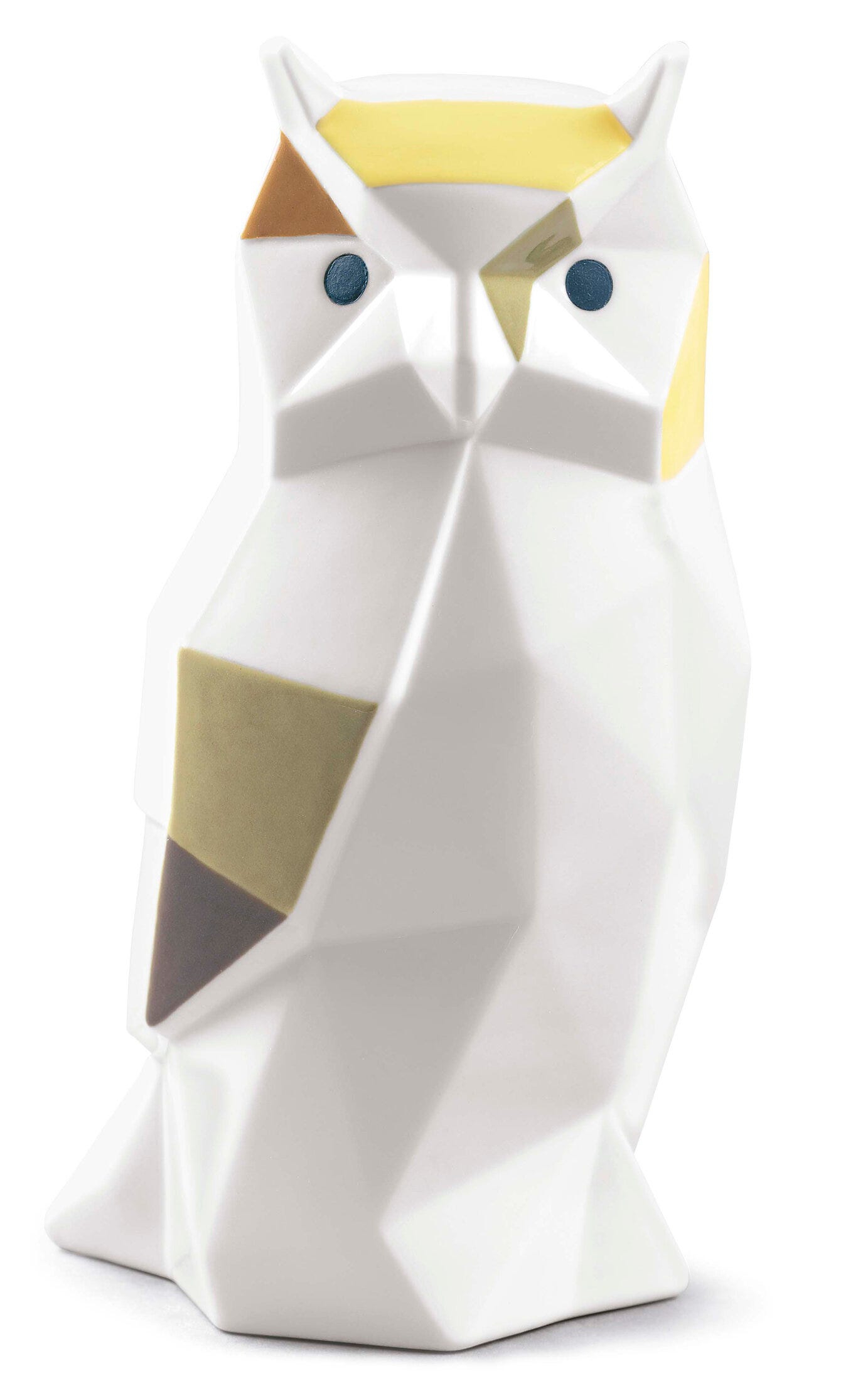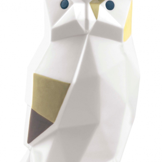 Figura di gufo in porcellana lucida. decorata con i colori verde e giallo. appartenente alla collezione origami. Altezza: 16 cm; Lunghezza: 8 cm; Profondita: 9 cm;