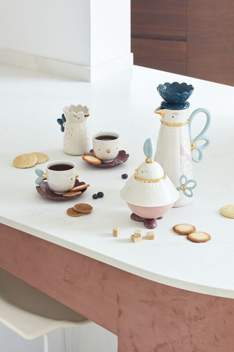 Zuccheriera in porcellana della collezione Kawki. un grazioso servizio da caffè ispirato al folclore slavo e all'amore per gli uccellini. Altezza: 21 cm; Lunghezza: 14 cm; Profondita: 17 cm;