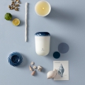 Candela profumata per ambiente in porcellana bianca opaca dall'aroma esotico con un coperchio in porcellana il cui disegno. inciso e dipinto a mano. ricorda un tornado. Altezza: 12 cm; Lunghezza: 8 cm; Profondita: 8 cm