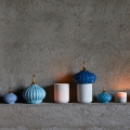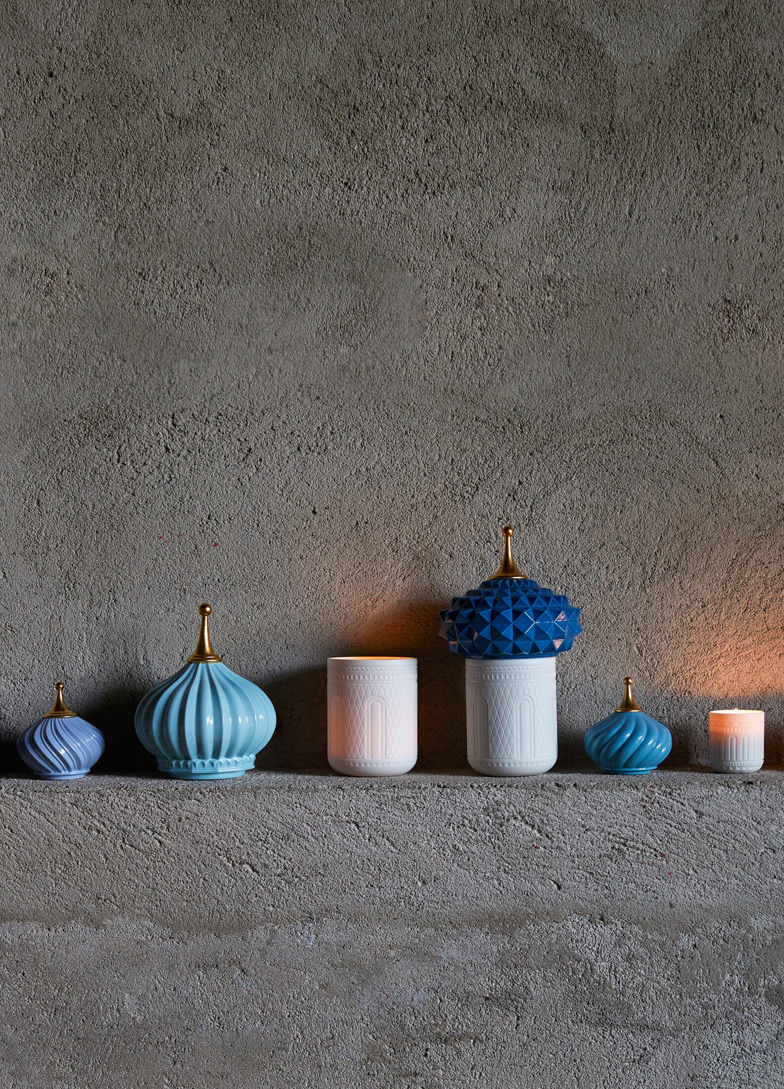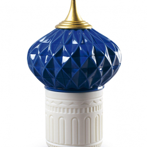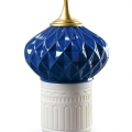 Candela profumata per ambiente dal disegno a forma di torre. Il bicchiere è in porcellana traslucida mentre il coperchio decorato con smalti blu e oro. Il suo aroma è il risultato di un mix di ingredienti molto speciali quali il cassis. il fiore di... Altezza: 13 cm; Lunghezza: 8 cm; Profondita: 8 cm