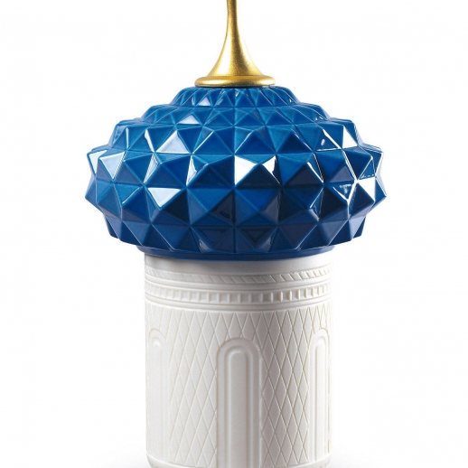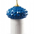 Candela profumata il cui disegno riproduce una torre. con contenitore in porcellana traslucida e coperchio in smalto azzurro e oro. Il suo aroma contiene ingredienti molto speciali come il cassis. il fiore di loto e l'incenso. Altezza: 22 cm; Lunghezza: 13 cm; Profondita: 13 cm