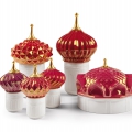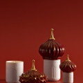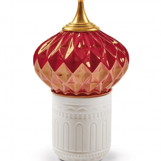 Candela profumata il cui disegno riproduce una torre. con contenitore in porcellana traslucida e coperchio in smalto rosso e oro. Il suo aroma contiene ingredienti molto speciali come il cassis. il fiore di loto e l'incenso. Altezza: 13 cm; Lunghezza: 8 cm; Profondita: 8 cm