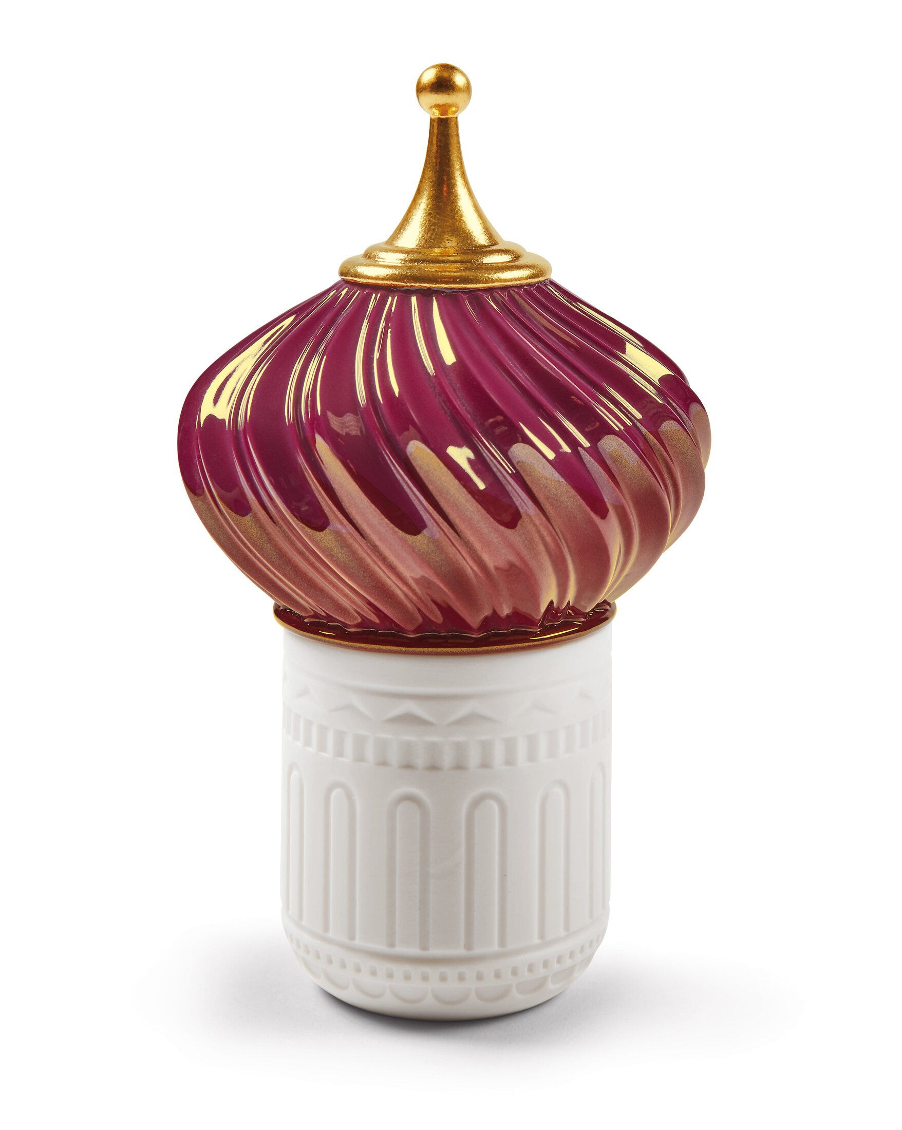 Candela profumata il cui disegno riproduce una torre. con contenitore in porcellana traslucida e coperchio in smalto rosso e oro. Il suo aroma contiene ingredienti molto speciali come il cassis. il fiore di loto e l'incenso. Altezza: 13 cm; Lunghezza: 8 cm; Profondita: 8 cm