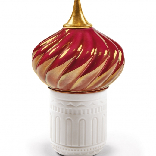 Candela profumata il cui disegno riproduce una torre. con contenitore in porcellana traslucida e coperchio in smalto rosso e oro. Il suo aroma contiene ingredienti molto speciali come il cassis. il fiore di loto e l'incenso. Altezza: 13 cm; Lunghezza: 8 cm; Profondita: 8 cm