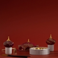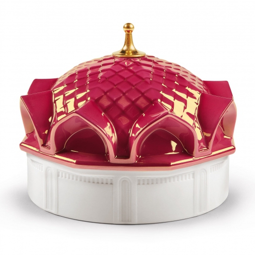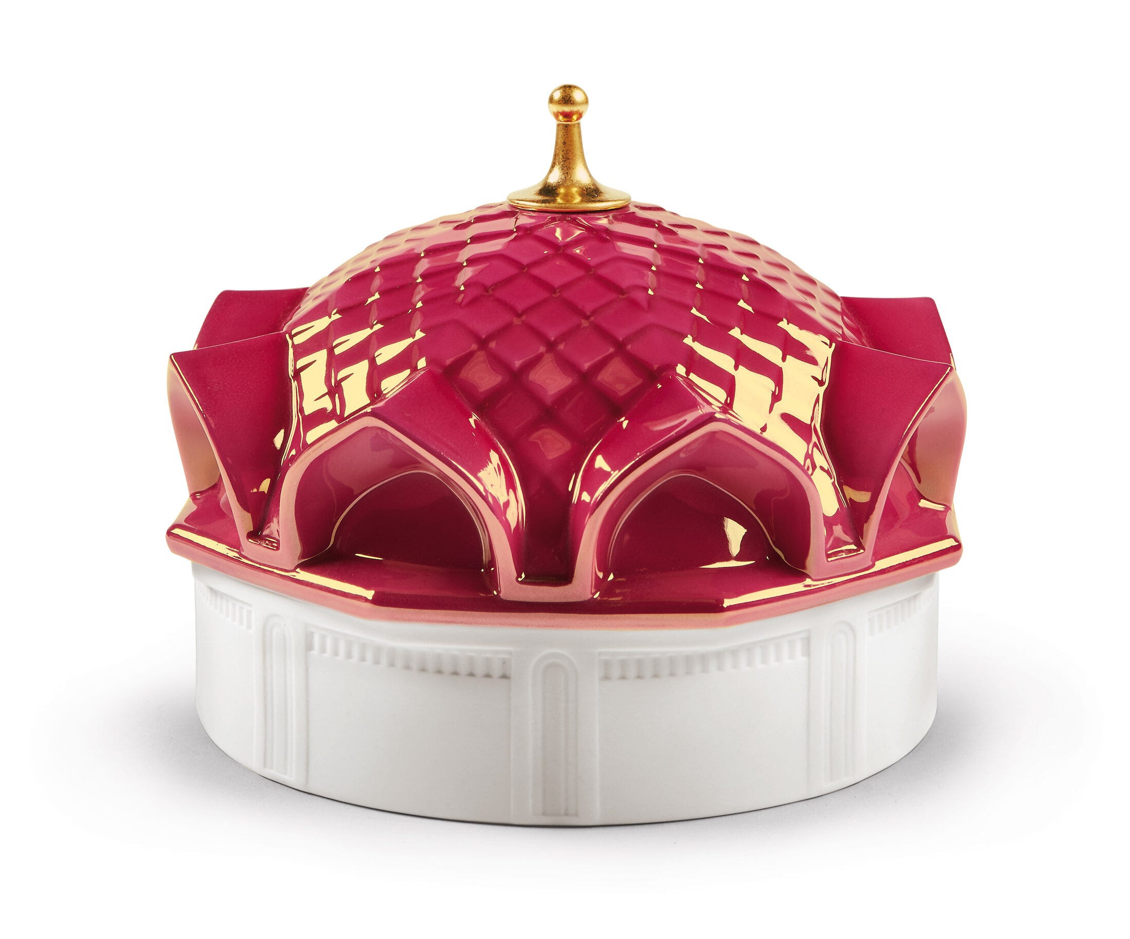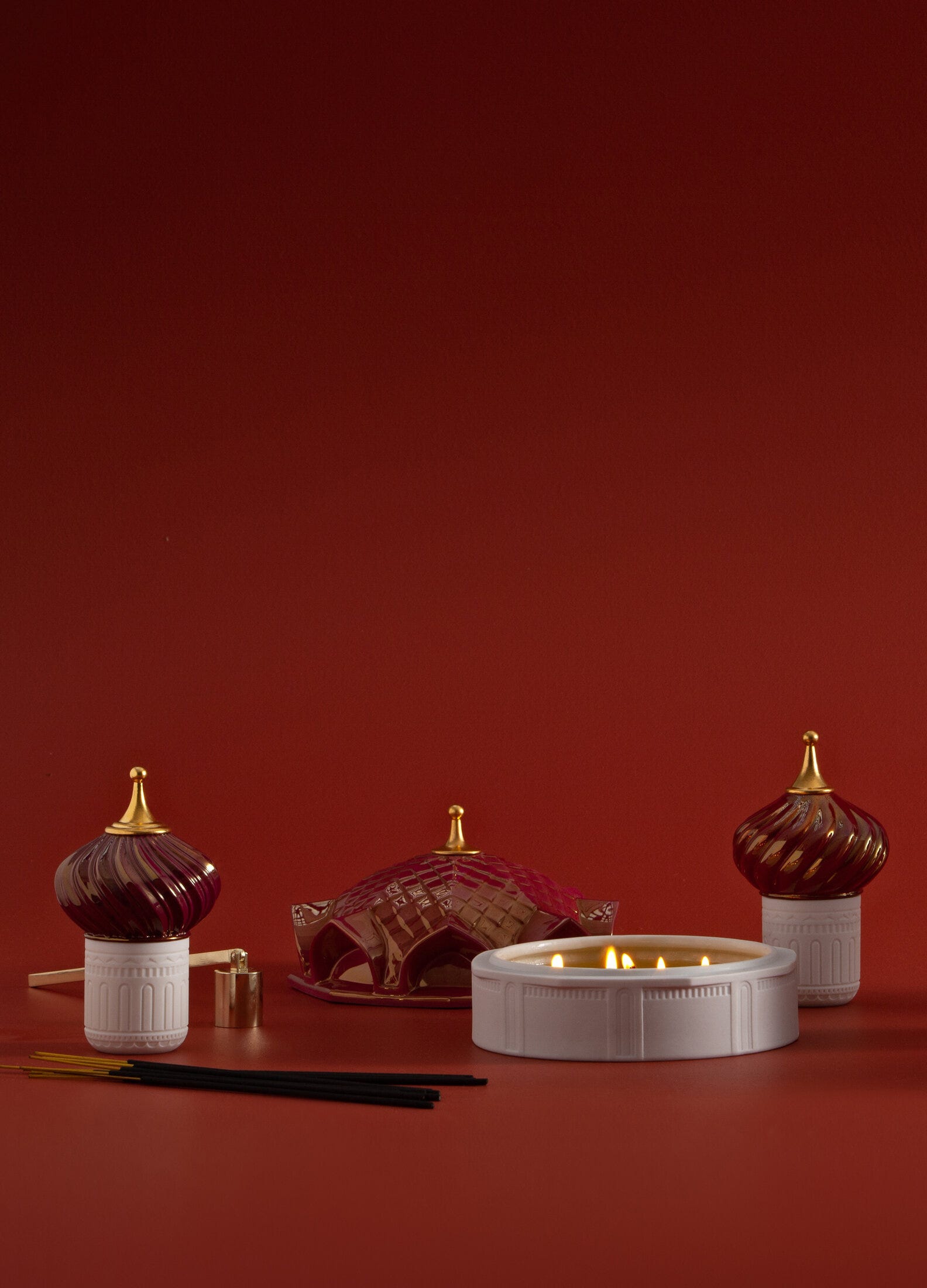 Candela profumata il cui disegno riproduce una torre. con contenitore in porcellana traslucida e coperchio in smalto rosso e oro. Il suo aroma contiene ingredienti molto speciali come il cassis. il fiore di loto e l'incenso. Altezza: 13 cm; Lunghezza: 17 cm; Profondita: 17 cm;