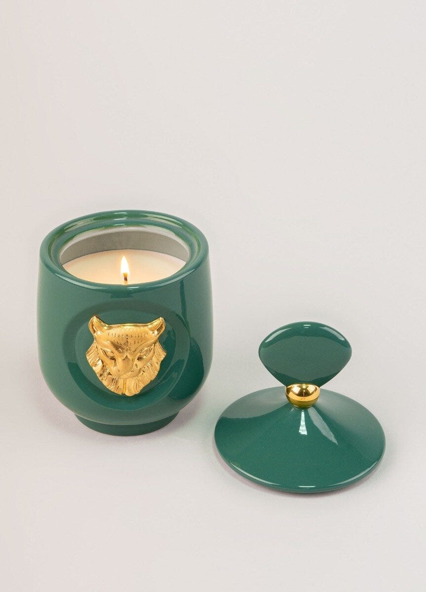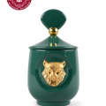 Candela della collezione Luxurious animals con il profumo Redwoodfire. Una fragranza con note di foglie di violetta e mimosa. legno di sandalo e cedro. Altezza: 21 cm; Lunghezza: 11 cm; Profondita: 11 cm