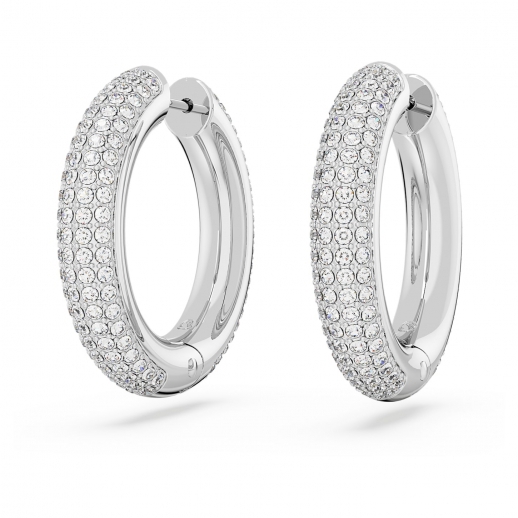 Questi orecchini stile industrial-chic sono pensati per un look d'effetto. Sfoggiando la nostra iconica tecnica pavé, ciascuno degli anelli circolari placcati rodio è impreziosito da scintillanti cristalli Cry all-over. Abbina questi orecchini con altri gioielli della famiglia Dextera e massimizza il tuo audace stile metallico.