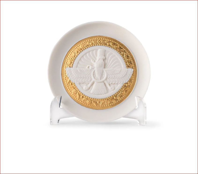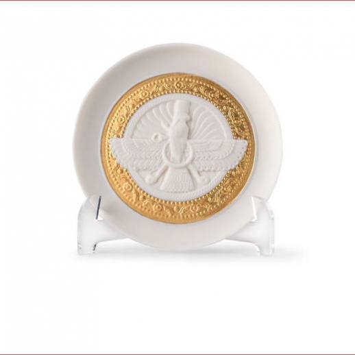 Piatto Asho Farohar Altezza: 10 cm - Lunghezza: 10 cm - Profondita: 5 cm Piatto in porcellana che raffigura Asho Farohar, simbolo protettore dei membri della comunità Parsi, discendenti dei praticanti del zoroastrismo persiano. Altezza: 10 cm; Lunghezza: 10 cm; Profondita: 5 cm