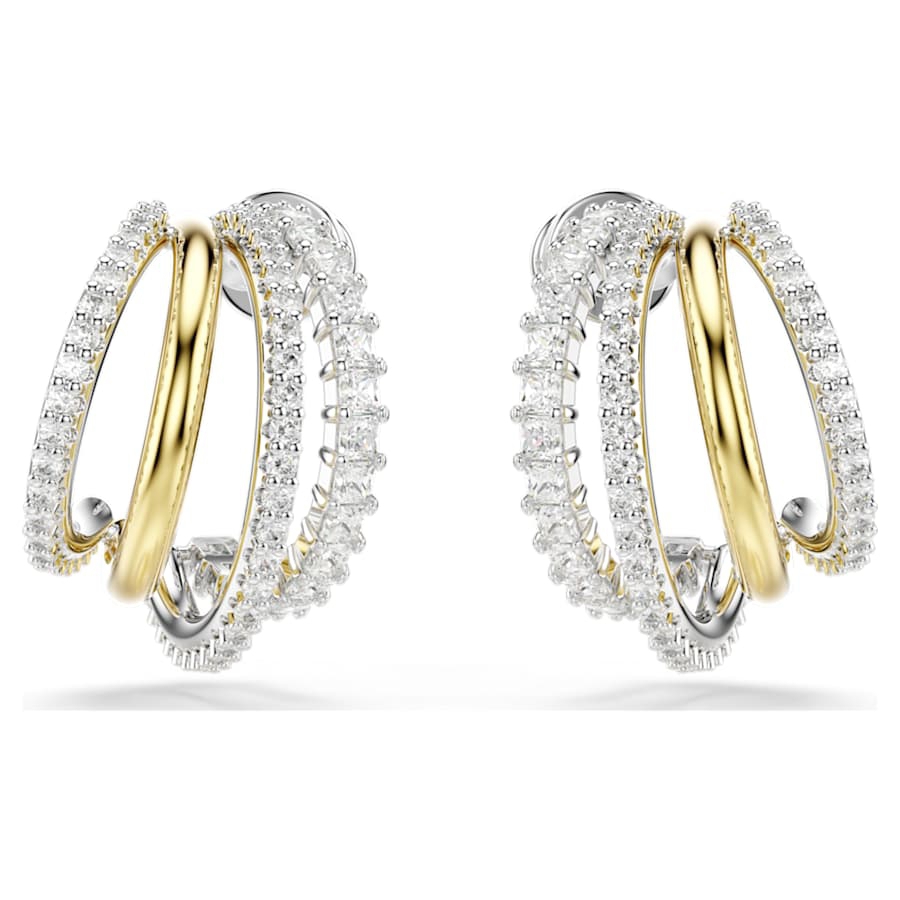 Questi orecchini Hyperbola dagli intricati dettagli trovano bellezza e armonia nei contrasti. Su ciascun lato, i quattro mini cerchi presentano una varietà di finiture del metallo, tra cui le placcature color oro e rodio, e presentano Swarovski Zirconia taglio Round e Square con montatura a griffe. Abbinali ad un bangle o ad una collana coordinati per intensificare il look.