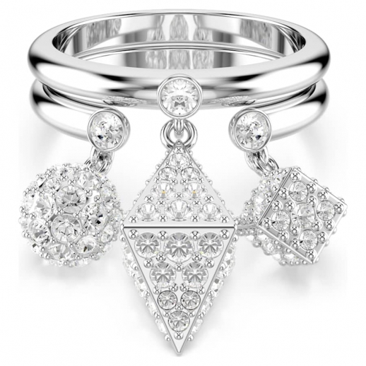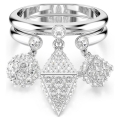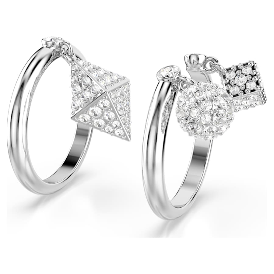 Questo set di anelli sfaccettati è caratterizzato da un fantasioso design che risplende nella sua unicità. La fascia aperta presenta una sfera e un cubo, oltre a singoli cristalli posti a ciascuna delle sue estremità, mentre la seconda fascia è impreziosita da un motivo triangolare. Entrambe sono placcate rodio e le loro decorazioni sono ravvivate da un pavé di cristalli non allineati, le cui taglie miste ne aumentano ancora la luminosità. Indossali insieme per un glamour dal gusto geometrico.