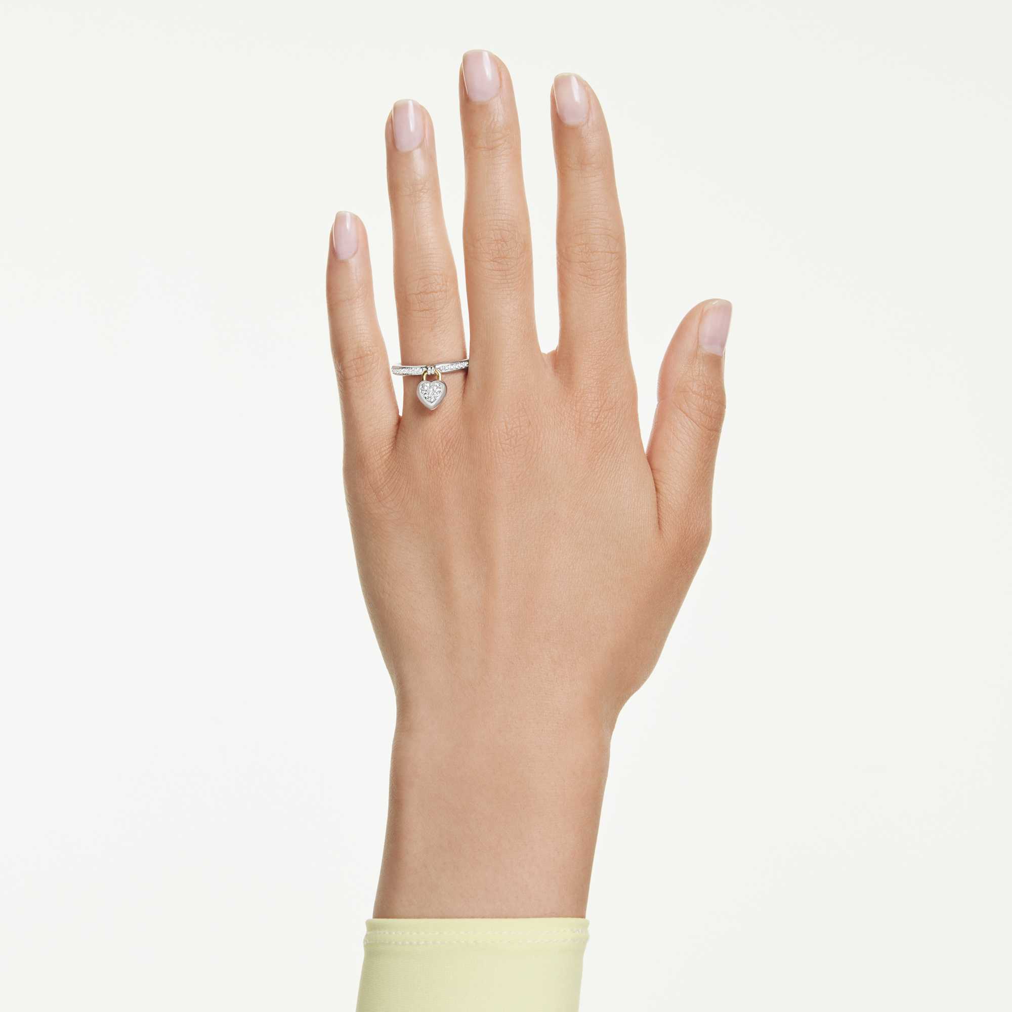 Un lussuoso simbolo di devozione, il sottile anello è impreziosito da cristalli Cry e presenta al centro un cuore ispirato a un medaglione. Il motivo romantico presenta un cuore di Swarovski Zirconia rosa con placcatura in tonalità oro su un lato, e un pavé di cristalli Cry con placcatura rodio sull'altro lato. Indossalo con il bangle coordinato per massimizzare il look dell'amore.