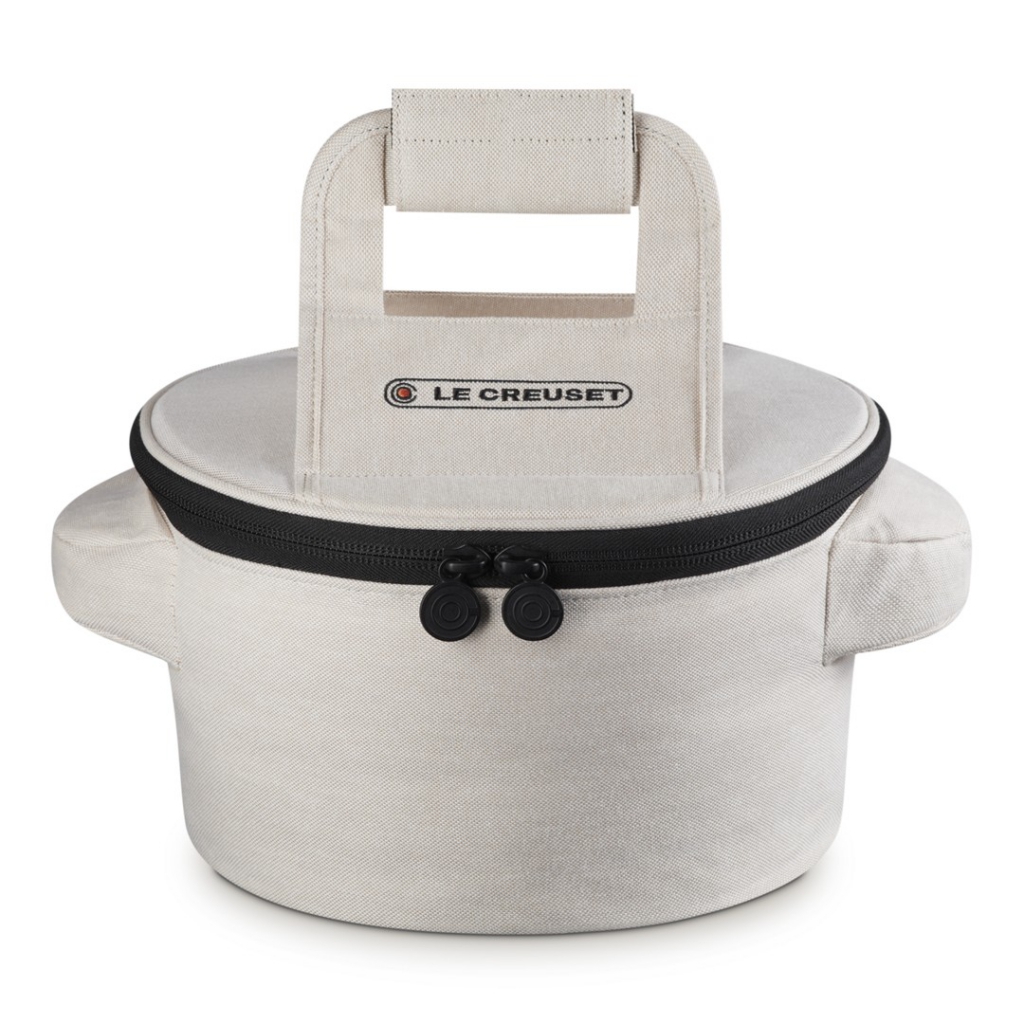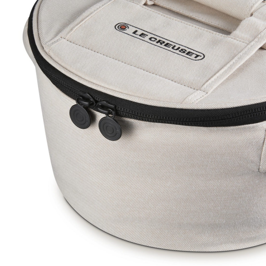 La Tote Bag per Cocotte Rotonda è l’accessorio ideale per trasportare le tue Cocotte in totale sicurezza, perfetta per picnic, gite fuori porta, campeggi e molte altre occasioni. Può essere utilizzata anche per riporre all’interno utensili da cucina, stoviglie e accessori. Realizzata in resistente tela di cotone, con manico rinforzato, robusta cerniera e tasca interna per utensili. La sua leggera imbottitura protegge i tuoi articoli da cucina e aiuta a mantenere caldo il cibo. Compatibile con le Cocotte Rotonde Le Creuset da 4,2 L e 5,3 L.